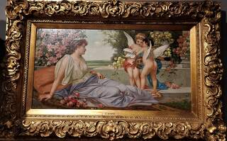 Kaufmann, Karl (1843 Neuplachowitz - 1905 Wien) ' Der Frühling'. Öl/Leinwand, links unten mit Pseudonym F. Rodek signiert, auf Rahmenschild bezeichnet. Junge Frau in antikisierender Kleidung schaut zwei Putten mit Notenblättern im Garten bei blühenden Rosenbüschen amüsiert zu.